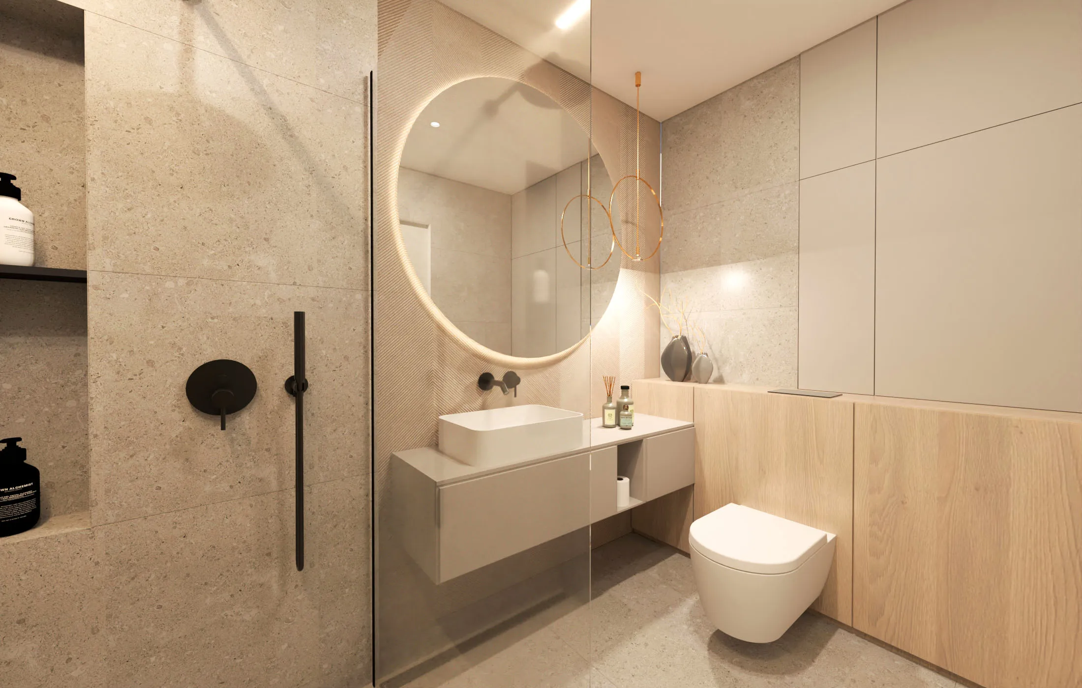 Słowo klucz przekazane od inwestorów tej inwestycji to „spójność”. Idąc tym tokiem myślenia udało mi się zaprojektować wnętrze, w którym czujemy, że każdy element, faktura i kolor pasuje do siebie idealnie. Wybrałam bazę materiałów, która w spójny sposób powtarzała się w każdym pomieszczeniu i spełniała swoją funkcję.